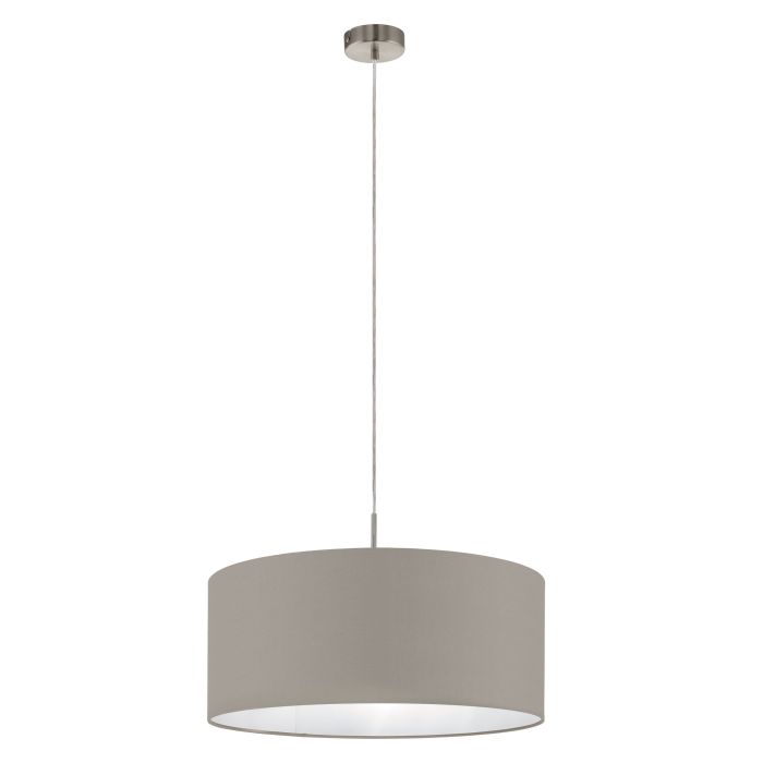Product Description The PASTERI pendant light features a round grey fabric lampshade paired with a satin nickel metal ceiling mount. The pendant light’s classic design blends...