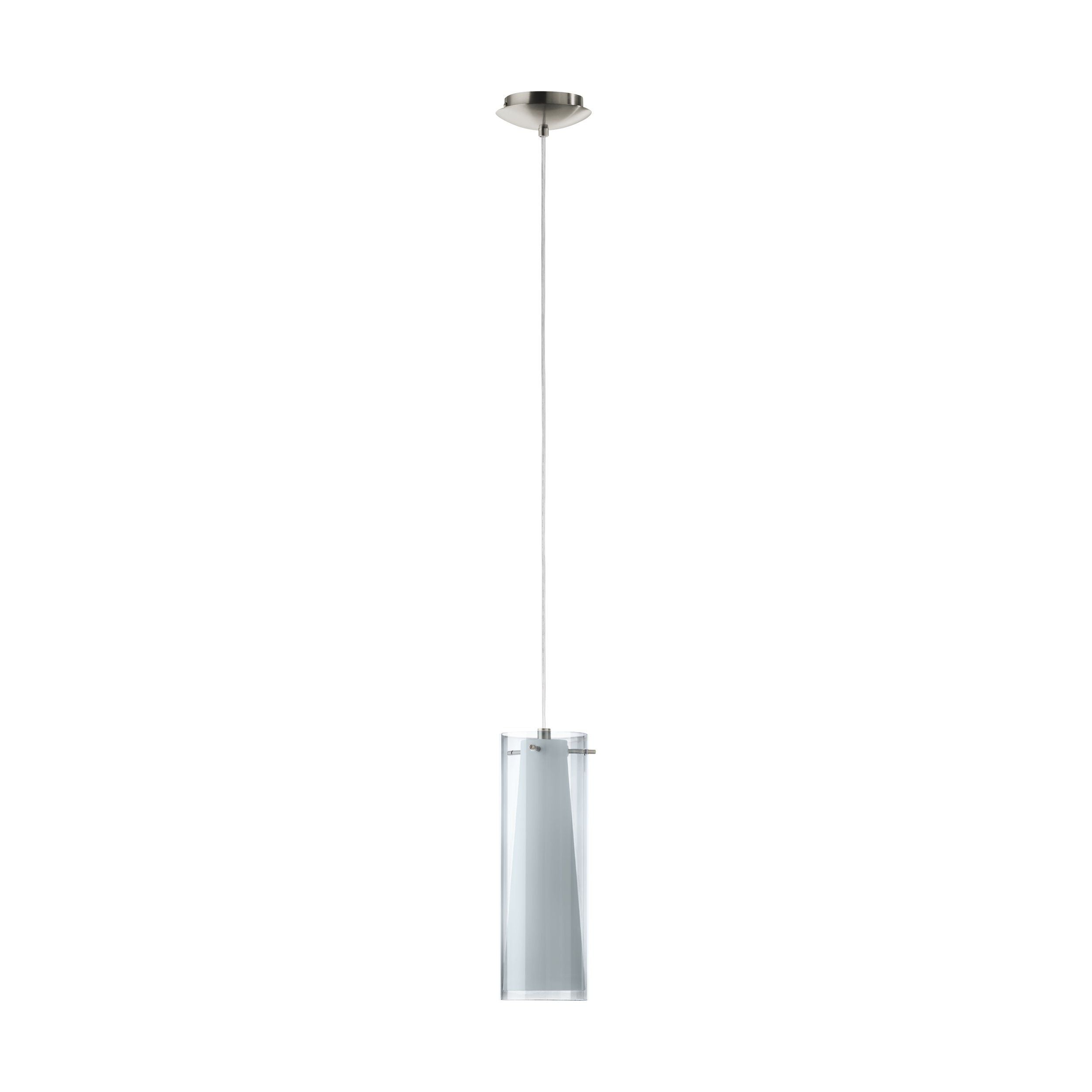 Product Description: The PINTO NERO pendant light has a cylindrical smoke-black glass lampshade suspended from a round metal canopy in a matte nickel finish. Inside there...